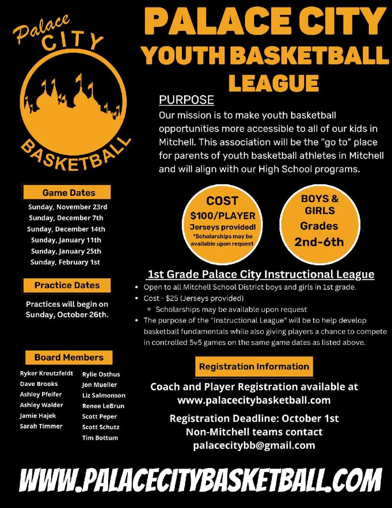 The Palace City Basketball Association exists to provide youth basketball opportunities in Mitchell and the surrounding areas.